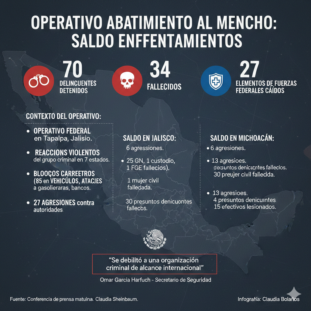 Señaló que se registraron 27 agresiones contra autoridades tras la acción para la detención de “El Mencho”.