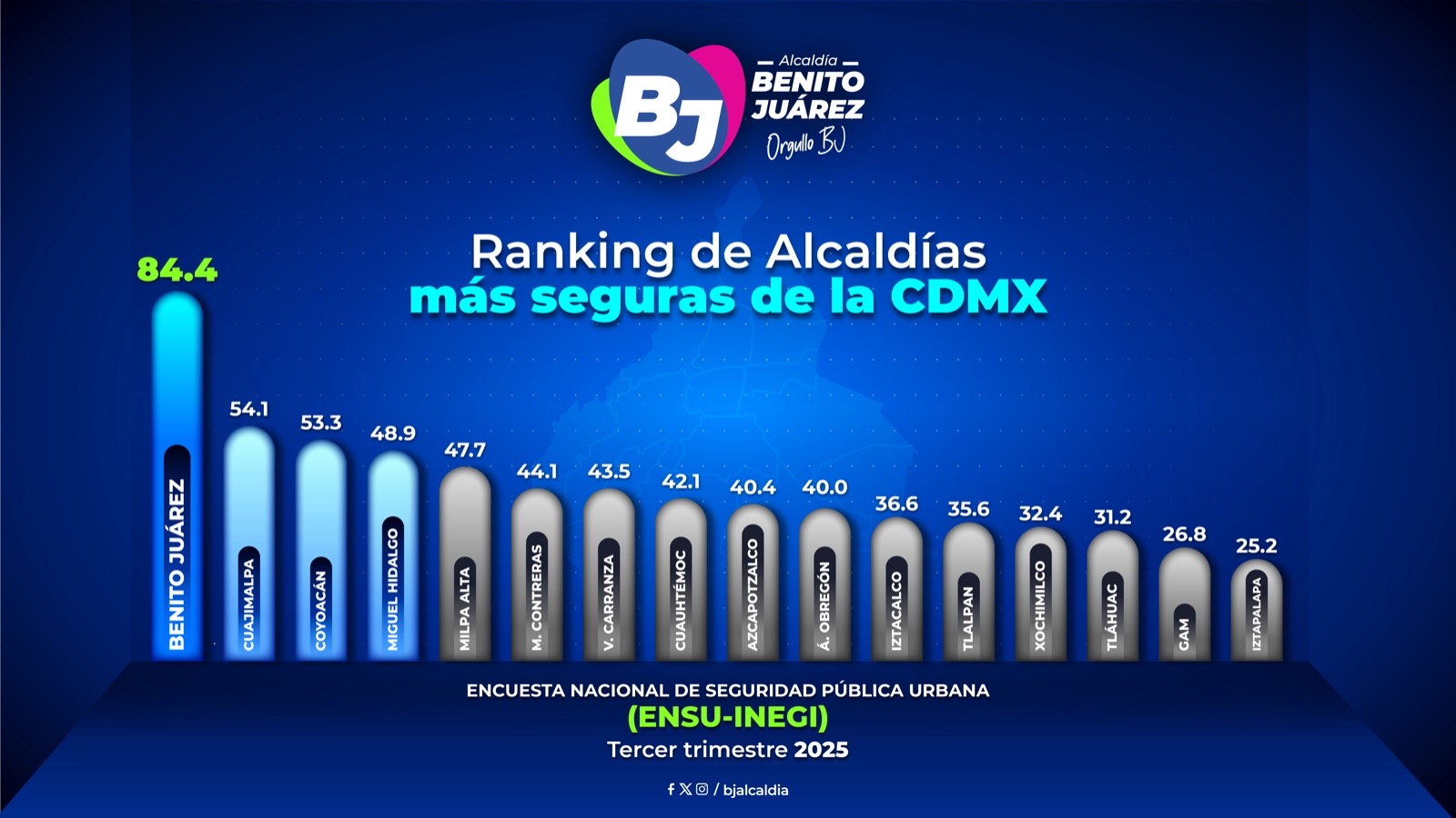 De acuerdo con los datos publicados hoy en la Encuesta Nacional de Seguridad Pública Urbana (ENSU) del INEGI, referentes al tercer trimestre de 2025, la alcaldía Benito Juárez se mantiene como la más segura de la Ciudad de México.