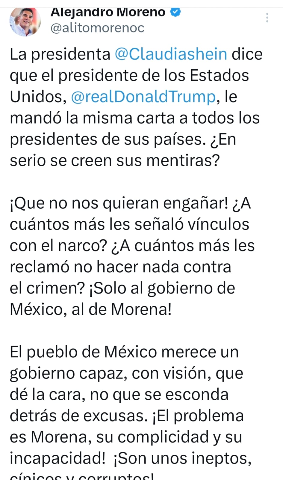 A través de redes sociales, Moreno desmintió la afirmación de Sheinbaum sobre que dicha misiva fue dirigida también a otros mandatarios, y acusó al gobierno federal de mentir para evadir su responsabilidad frente a la inseguridad y los señalamientos internacionales.