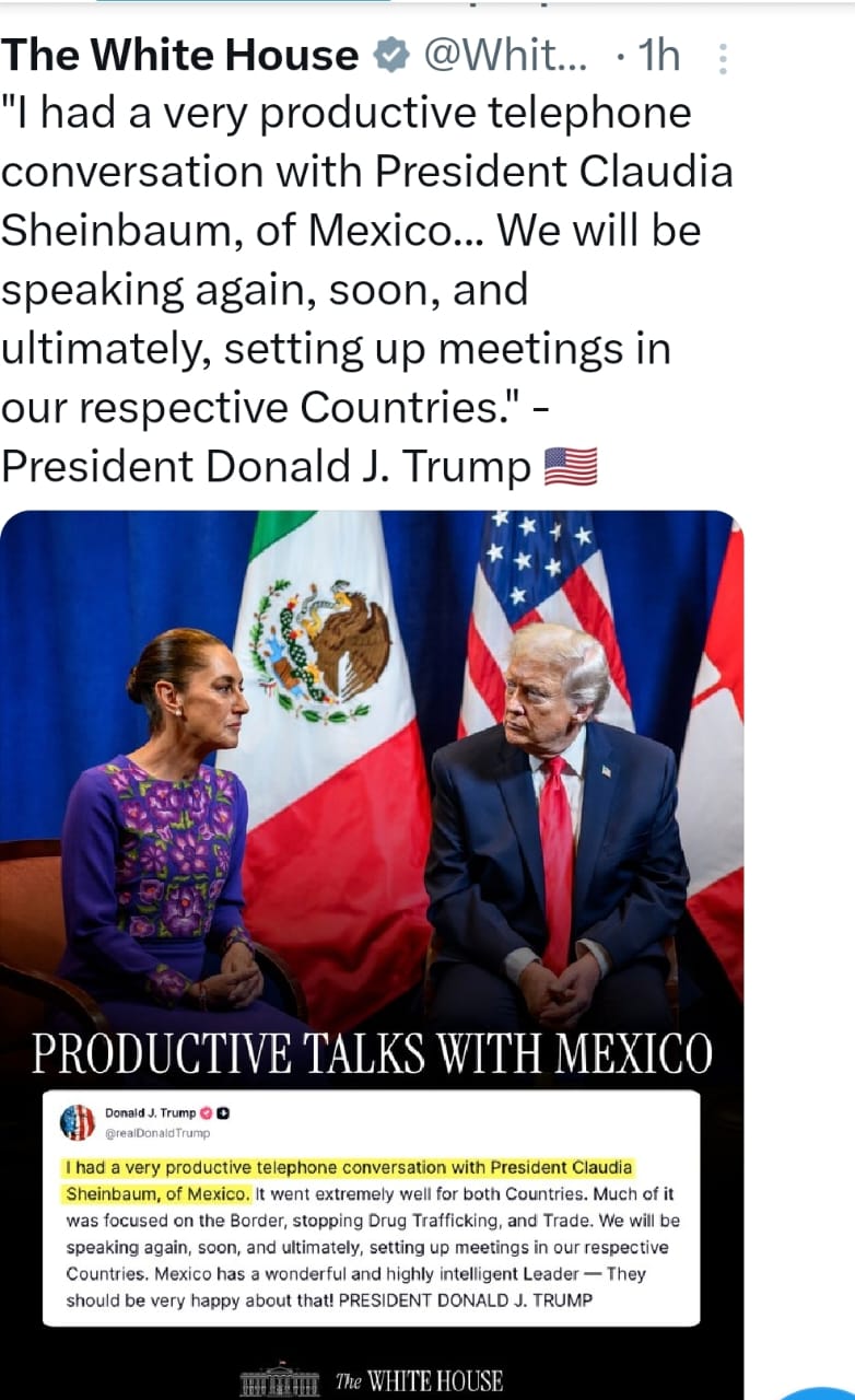 Posteriormente, Donald Trump difundió un mensaje en su red social Truth Social en el que describió la conversación como productiva y positiva para ambos países, destacando asuntos vinculados a la frontera, el combate al tráfico de drogas y el comercio. Claudia Sheinbaum agradeció el mensaje y afirmó que coincide con lo expuesto por ella sobre el contenido de la llamada.