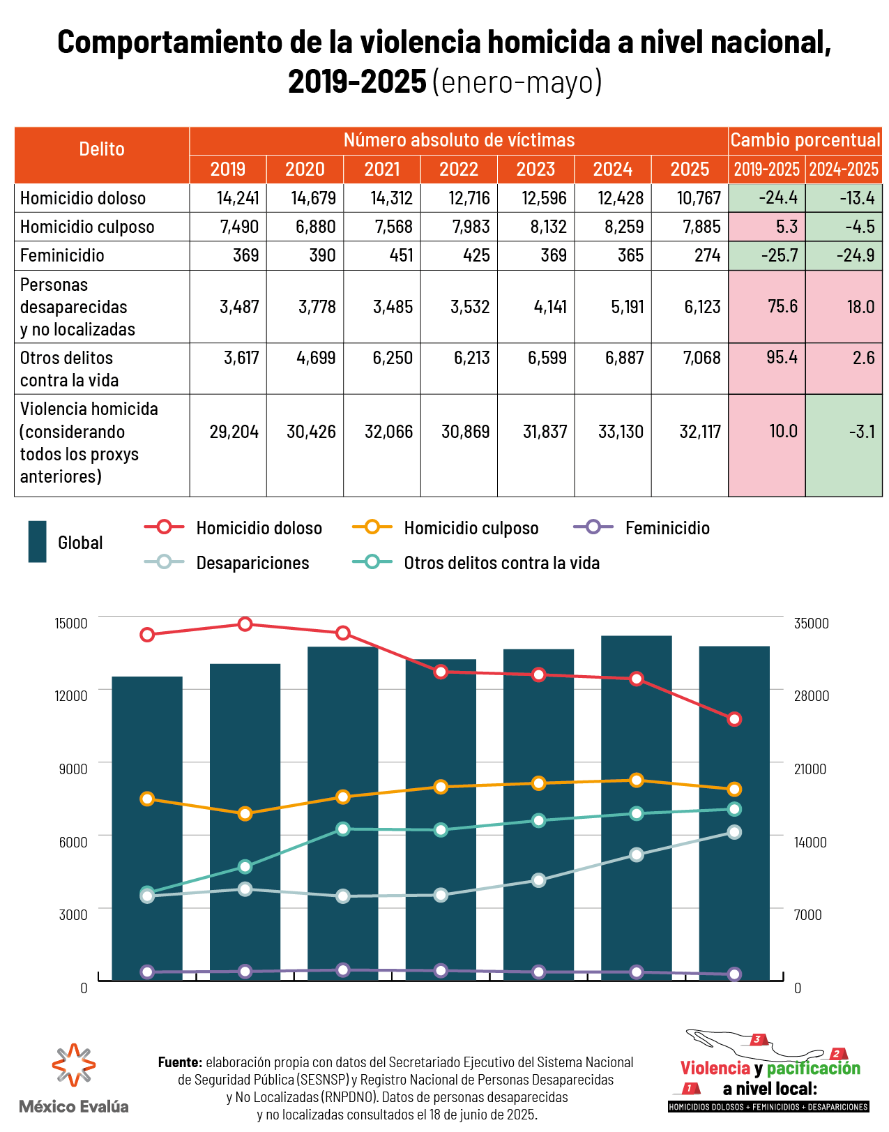 A pesar de que el Sistema Nacional de Seguridad Pública reportó una disminución del 25.8% en el promedio diario de homicidios dolosos en mayo de 2025 comparado con septiembre de 2024, la organización México Evalúa advierte que estas cifras no reflejan la realidad de la violencia homicida en el país. La organización argumenta que las estadísticas oficiales no consideran las deficiencias institucionales en la identificación y registro de cadáveres, ni las tácticas del crimen organizado para desaparecerlos.