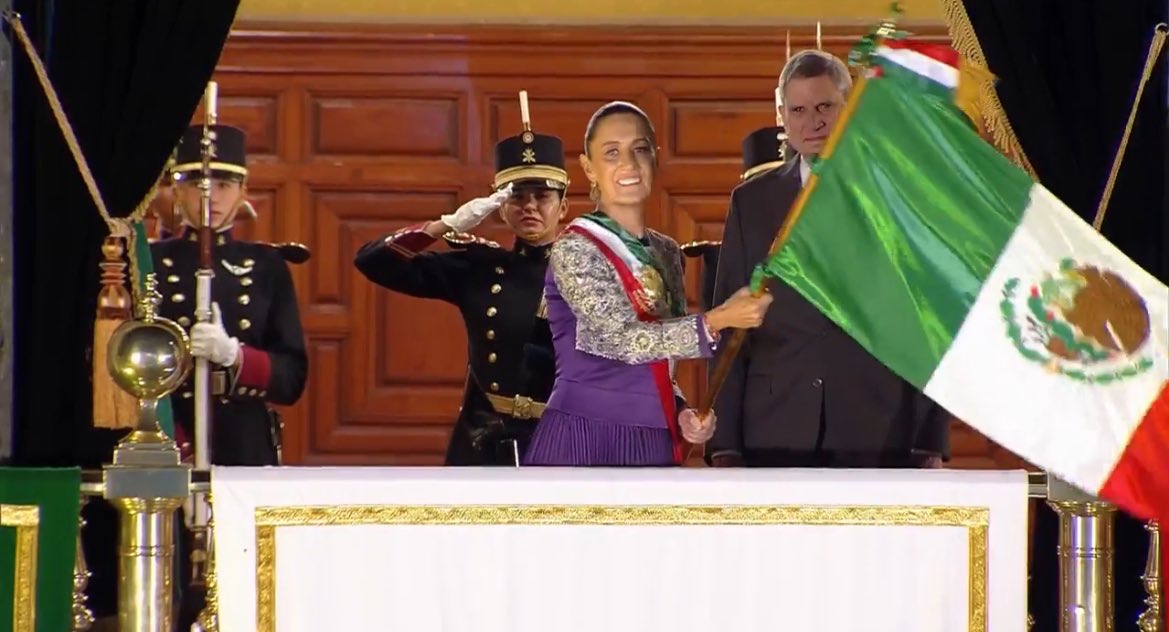 La mandataria, acompañada de su esposo Jesús María Tarriba y vestida en morado y plateado con la banda presidencial confeccionada por mujeres militares, recibió la bandera de una escolta integrada solo por cadetes mujeres. Salió al balcón del Zócalo lleno para pronunciar las arengas patrias, en las que destacó a heroínas como Josefa Ortiz de Domínguez, Leona Vicario y Gertrudis Bocanegra, así como a mujeres indígenas y migrantes.