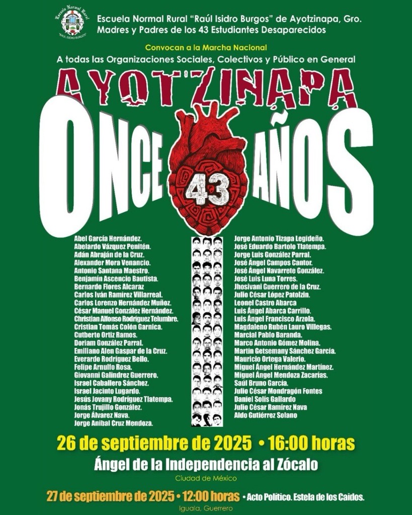Familiares de los normalistas convocaron para el viernes 26 de septiembre una movilización desde el Ángel de la Independencia hacia el Zócalo capitalino, como parte de las acciones para exigir justicia y esclarecimiento del caso.