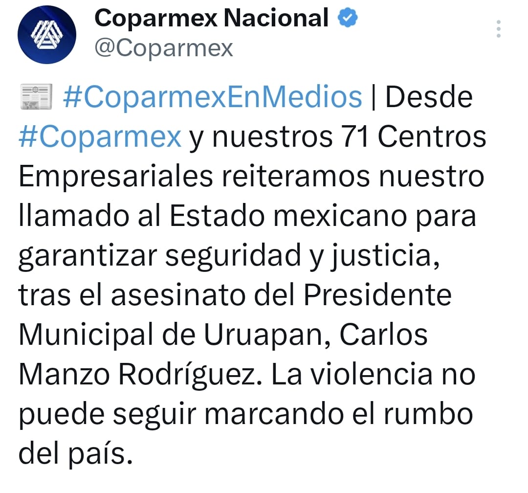 La Confederación Patronal de la República Mexicana (Coparmex) lamentó el asesinato de Carlos Manzo Rodríguez, presidente municipal de Uruapan, Michoacán, ocurrido el pasado fin de semana, y llamó a las autoridades a reforzar la seguridad y garantizar justicia en todo el país.