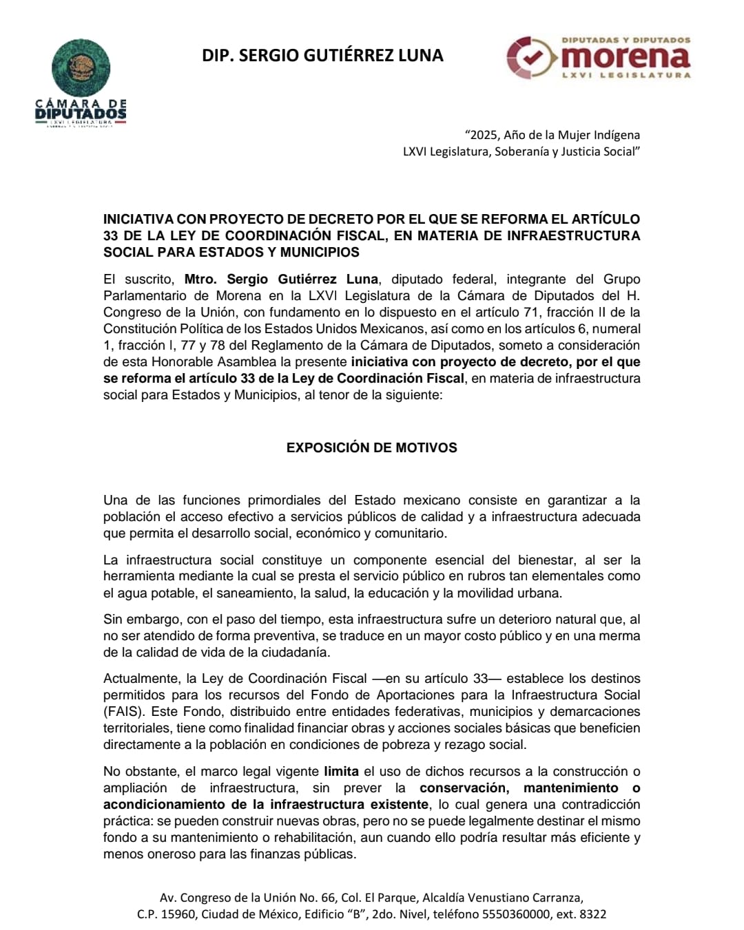 El diputado federal Sergio Gutiérrez Luna, del Grupo Parlamentario de Morena, presentó una iniciativa con proyecto de decreto para reformar el artículo 33 de la Ley de Coordinación Fiscal, con el fin de permitir que los recursos del Fondo de Aportaciones para la Infraestructura Social (FAIS) puedan emplearse no solo en la construcción de nueva infraestructura social, sino también en el mantenimiento, conservación y acondicionamiento de la ya existente.
