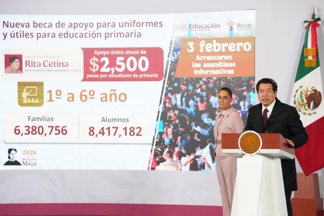 Detalló que, desde el pasado 3 de febrero, la Coordinación Nacional de Becas para el Bienestar (CNBB) inició las asambleas informativas en todas las primarias públicas del país para incorporar a 8 millones 417 mil 182 niñas y niños de primero a sexto de primaria, con el objetivo de entregar apoyos para útiles y uniformes escolares para el ciclo escolar 2026–2027, a través de la Beca Rita Cetina.