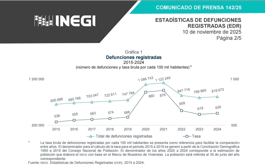 La tasa bruta de mortalidad fue de 630 defunciones por cada 100 mil habitantes, 11 unidades más que la reportada en 2023.