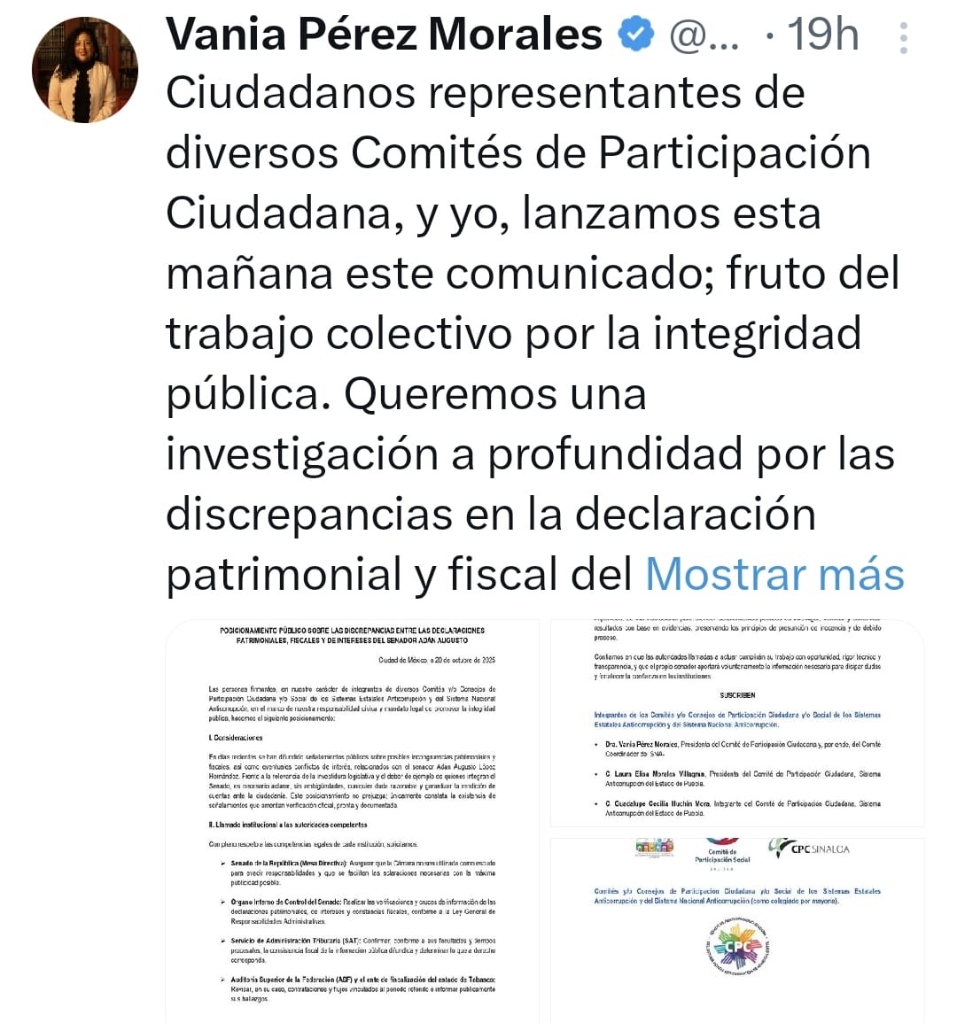 “Queremos una investigación a profundidad por las discrepancias en la declaración patrimonial y fiscal del senador. Pero ante presiones y acoso al equipo, se ordenó bajarlo de las redes. Como mexicana que lucha por la integridad en mi país, rechazo la censura”, escribió Pérez Morales en X, con los hashtags #CeroImpunidad e #IntegridadPública.