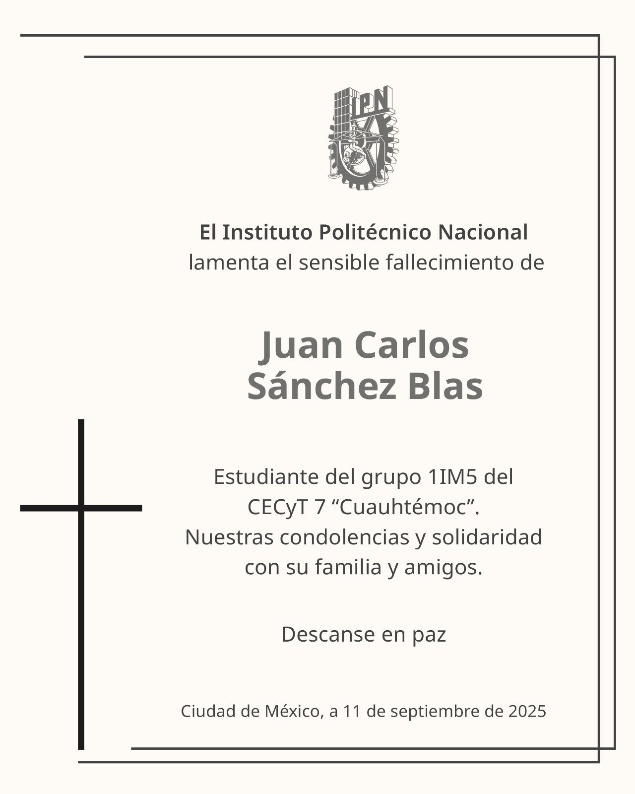 <span;>De igual forma, se confirmó la muerte del estudiante de la Vocacional 7 del Instituto Politécnico Nacional (IPN), Juan Carlos Sánchez Blass, lo que ha provocado consternación en ambas casas de estudio, consideradas las más importantes del país.