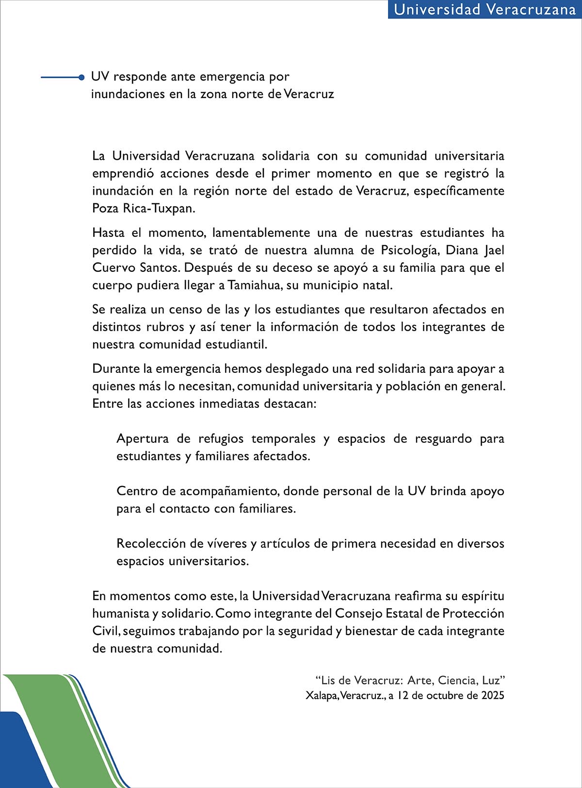 La presidenta Claudia Sheinbaum Pardo informó que, tras las inundaciones registradas en Poza Rica, Veracruz, se confirmó el fallecimiento de dos estudiantes de la Universidad Veracruzana, mientras continúa la búsqueda y localización de personas que podrían encontrarse atrapadas o incomunicadas en viviendas cubiertas por lodo.