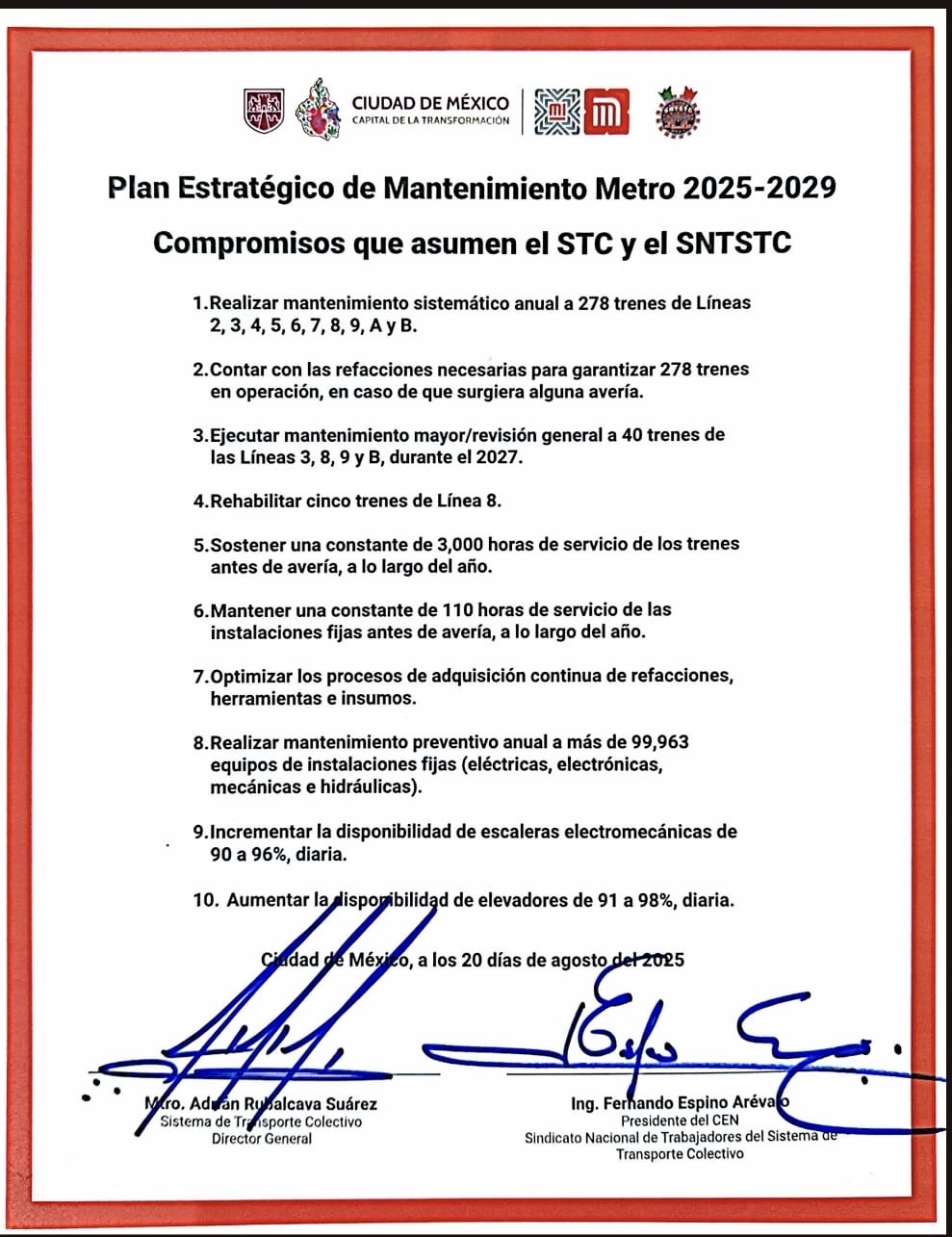 El director general, Adrián Rubalcava Suárez, y el presidente del Sindicato, Fernando Espino Arévalo, suscribieron el acuerdo que busca garantizar un servicio seguro y eficiente para millones de usuarios.