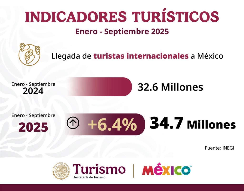 De acuerdo con la Encuesta de Viajeros Internacionales del Inegi, un total de 34.7 millones de turistas internacionales arribaron al país en los primeros nueve meses del año, 6.4% más que en 2024.
