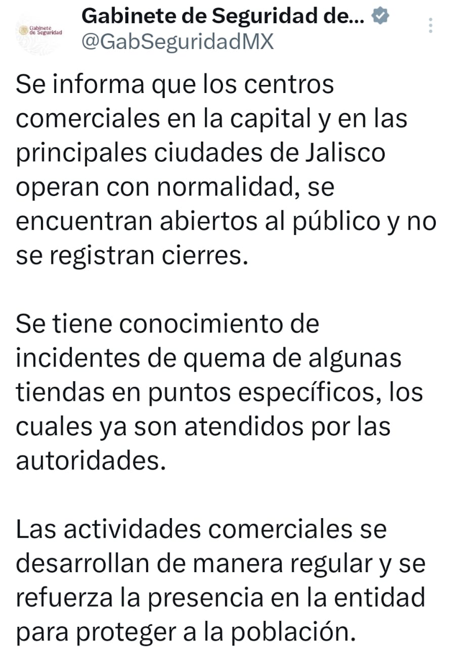 El Gabinete de Seguridad informó, a través de sus redes sociales, que los centros comerciales en la capital y en las principales ciudades de Jalisco operan con normalidad, se encuentran abiertos al público y no se registran cierres.