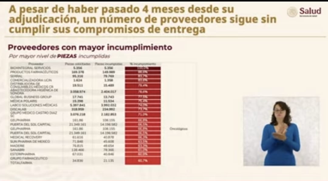 El funcionario presentó la lista de proveedores con mayor nivel de incumplimiento en sus contratos de entrega: Bioxintegral Servicios (100 por ciento), Productos Farmacéuticos (88.6), Serral (83.7), Comercializadora Ucin (83.6), Distribuidora de Consumibles Médicos CR (79.4), Abastecedora Higiénica de Sonora (78.6), Global Bussines Group (77.5), Médica Polaris (75.4), Labco Soluciones Médicas (74), Discalab (73.7) y Grupo Médico Castro Díaz S.C. (71).