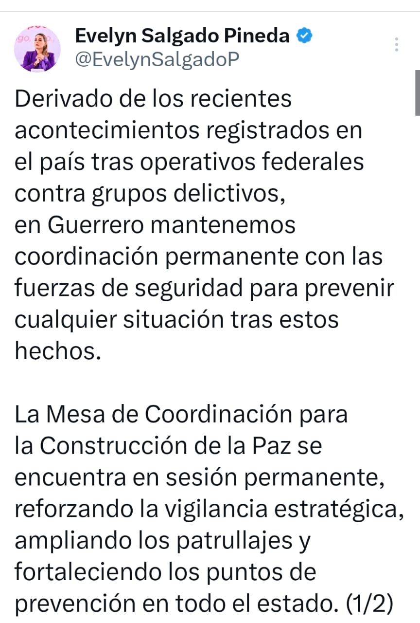 La gobernadora de Guerrero, Evelyn Salgado Pineda, informó que, derivado de los recientes acontecimientos registrados en el país tras operativos federales contra grupos delictivos, en la entidad se mantiene coordinación permanente con las fuerzas de seguridad para prevenir cualquier situación.