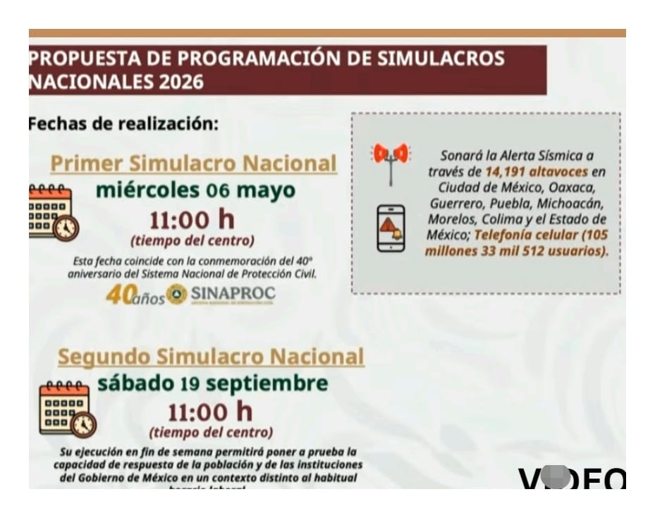 Asimismo, informó que este año se llevarán a cabo dos simulacros nacionales. El primero será el miércoles 6 de mayo a las 11:00 horas, tiempo del centro, en el marco del 40 aniversario del Sistema Nacional de Protección Civil.
