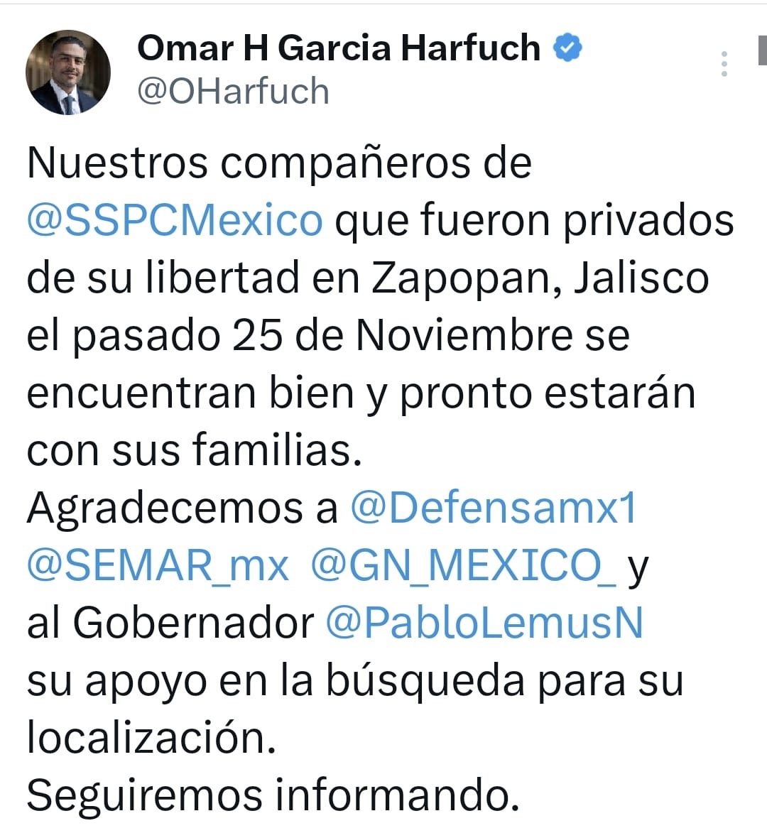 La presidenta Claudia Sheinbaum Pardo informó que fueron localizados con vida los dos elementos de la Secretaría de Seguridad y Protección Ciudadana (SSPC) que habían sido reportados como desaparecidos en Zapopan, Jalisco tras un operativo de investigación.