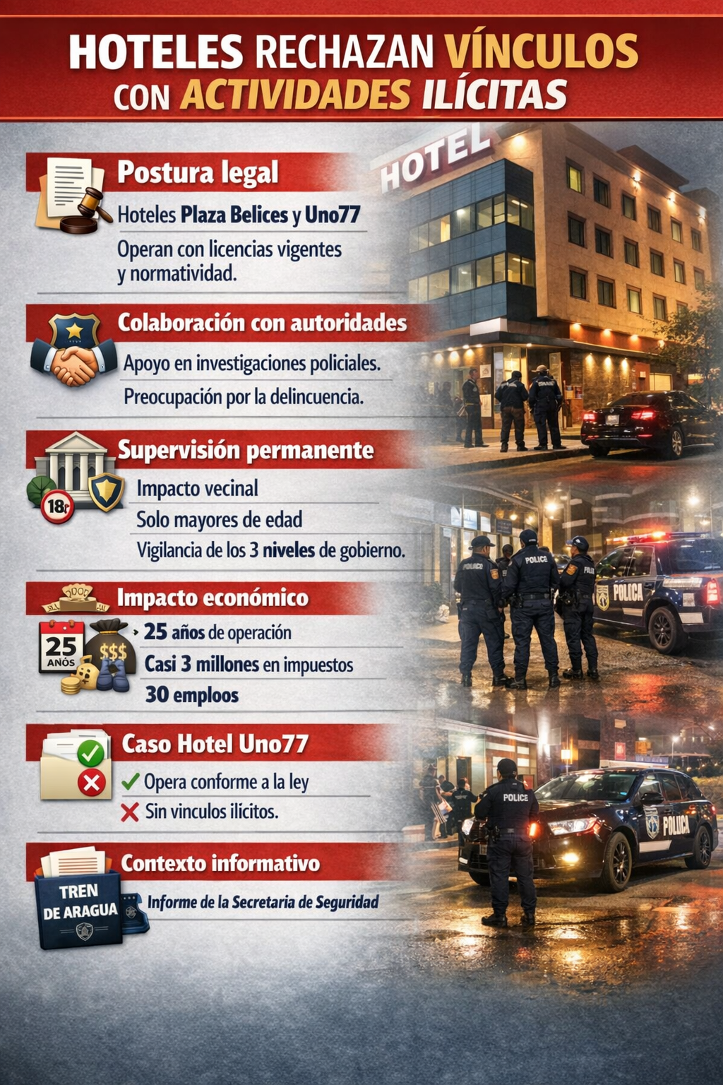 Los representantes legales de los hoteles Plaza Belices y Uno77 aseguraron que ambos establecimientos operan con licencias mercantiles vigentes y cumplen con la normatividad aplicable, por lo que negaron cualquier relación con actividades delictivas.