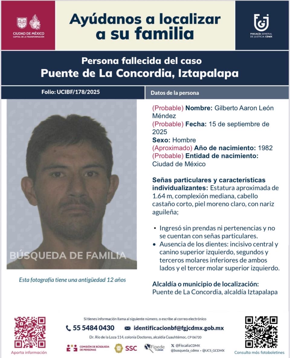 La Fiscalía capitalina solicitó apoyo de la ciudadanía para localizar a familiares de Gilberto León Aarón Méndez, quien falleció como consecuencia de la explosión en el Puente de la Concordia, alcaldía Iztapalapa.