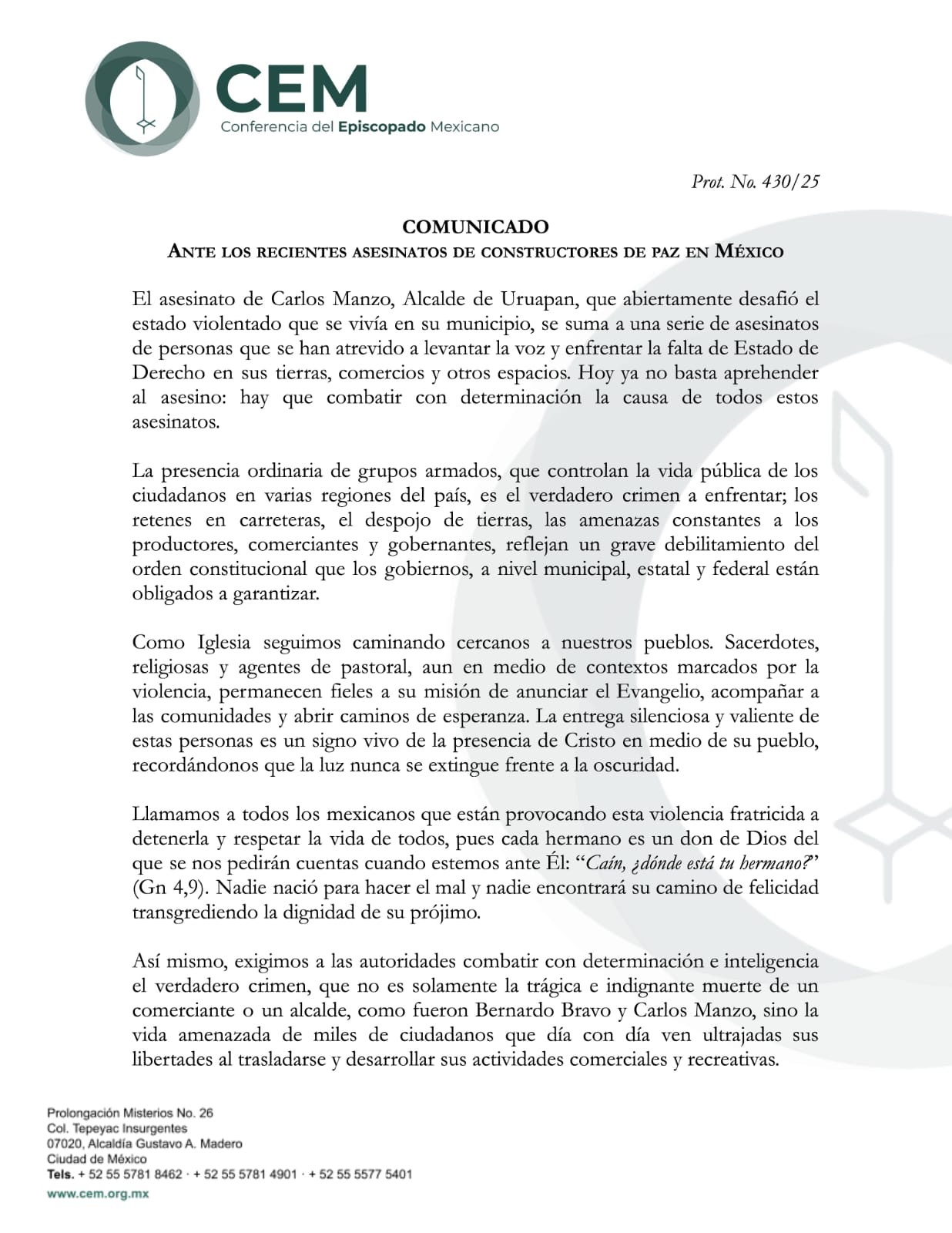 La Conferencia del Episcopado Mexicano (CEM) señaló que el asesinato de Carlos Manzo, Alcalde de Uruapan, se suma a una serie de homicidios de personas que se han atrevido a levantar la voz y enfrentar la falta de Estado de Derecho en sus tierras, comercios y otros espacios.