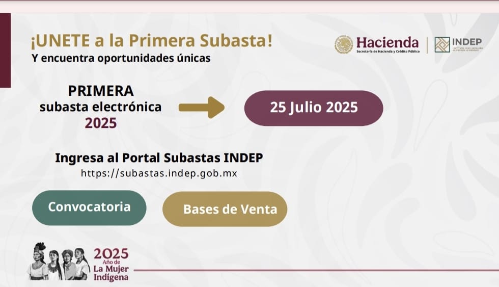 La primera subasta del actual gobierno se llevará a cabo del 25 de julio al 6 de agosto a través del portal https://subastas.indep.gob.mx, donde se pondrán a disposición del público joyas, terrenos, casas habitación, locales comerciales, vehículos, bienes muebles y algunos bienes financieros.