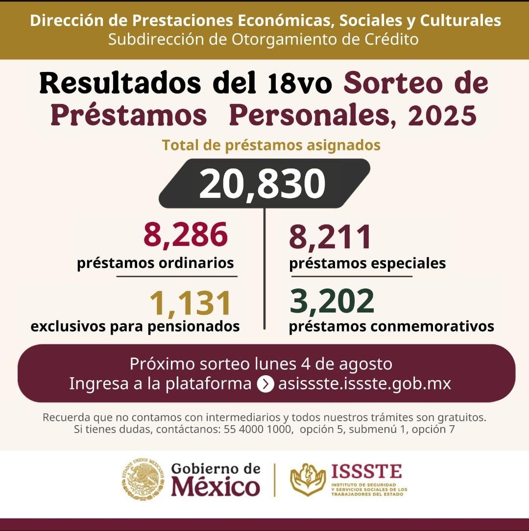 El Instituto de Seguridad y Servicios Sociales de los Trabajadores del Estado (ISSSTE), encabezado por el director general Martí Batres Guadarrama, informó que en el decimoctavo sorteo convencional del Programa Anual de Préstamos Personales 2025 se asignaron 20 mil 830 créditos, es decir, salieron todos aquellos que cumplieron los requisitos.