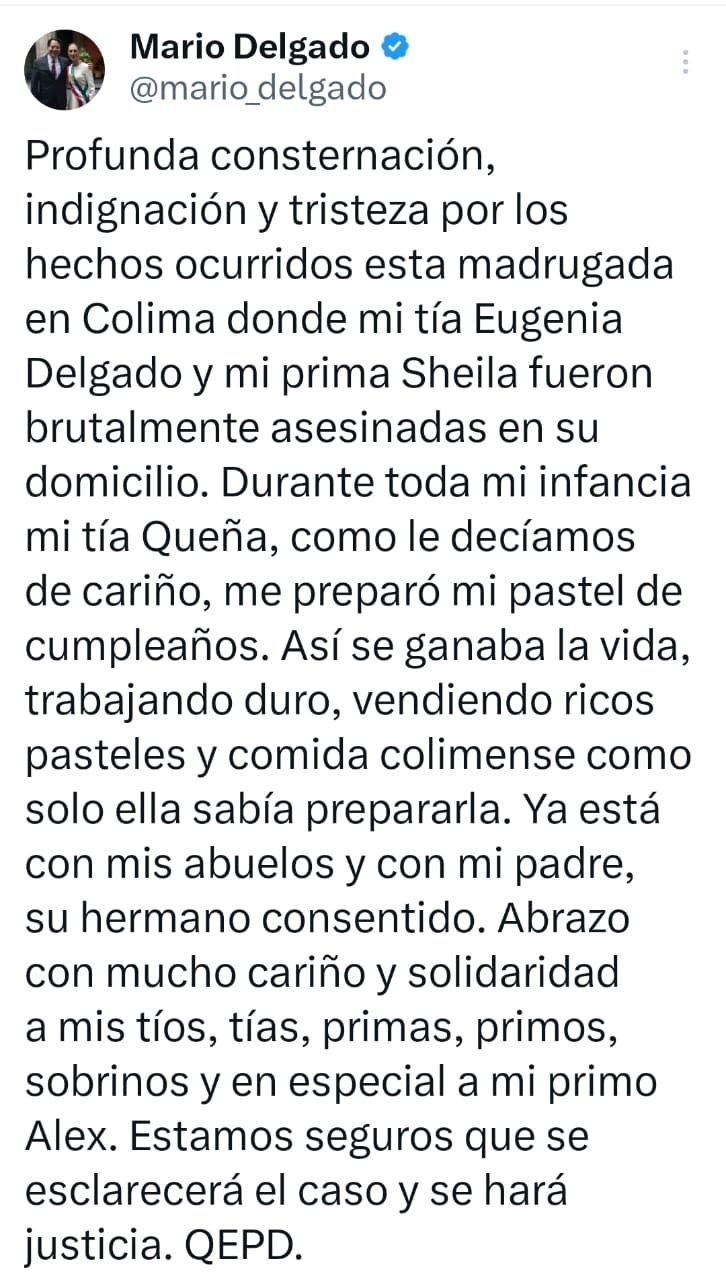 “Profunda consternación, indignación y tristeza por los hechos ocurridos esta madrugada en Colima donde mi tía Eugenia Delgado y mi prima Sheila fueron brutalmente asesinadas en su domicilio. Durante toda mi infancia mi tía Queña, como le decíamos de cariño, me preparó mi pastel de cumpleaños. Así se ganaba la vida, trabajando duro, vendiendo ricos pasteles y comida colimense como solo ella sabía prepararla. Ya está con mis abuelos y con mi padre, su hermano consentido. Abrazo con mucho cariño y solidaridad a mis tíos, tías, primas, primos, sobrinos y en especial a mi primo Alex. Estamos seguros que se esclarecerá el caso y se hará justicia. QEPD.”