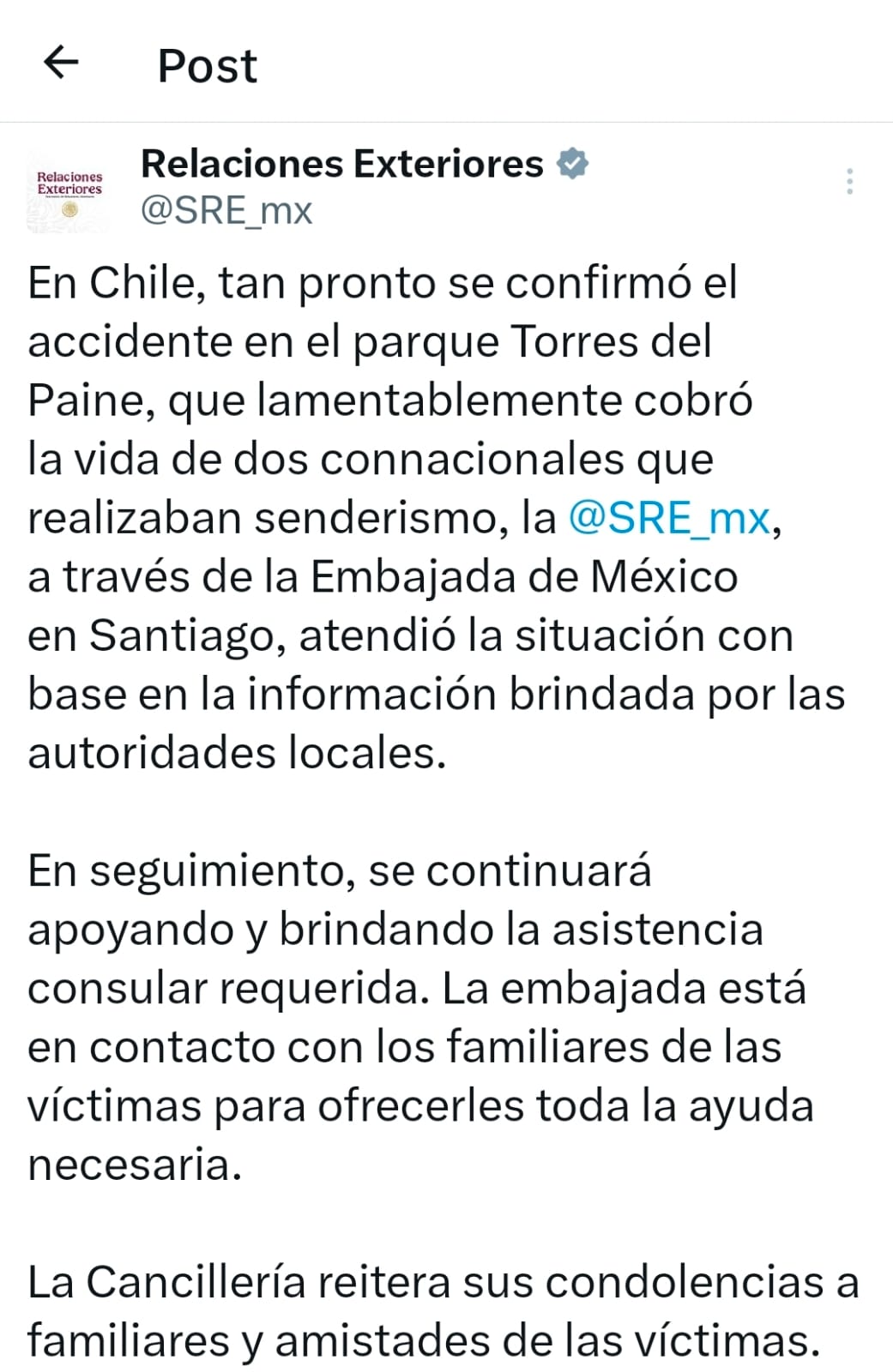La SRE mexicana mantiene su compromiso de acompañar a las familias de las víctimas en coordinación con las autoridades chilenas, en un momento que ha puesto de relieve la vulnerabilidad incluso en destinos naturales de alto renombre mundial.