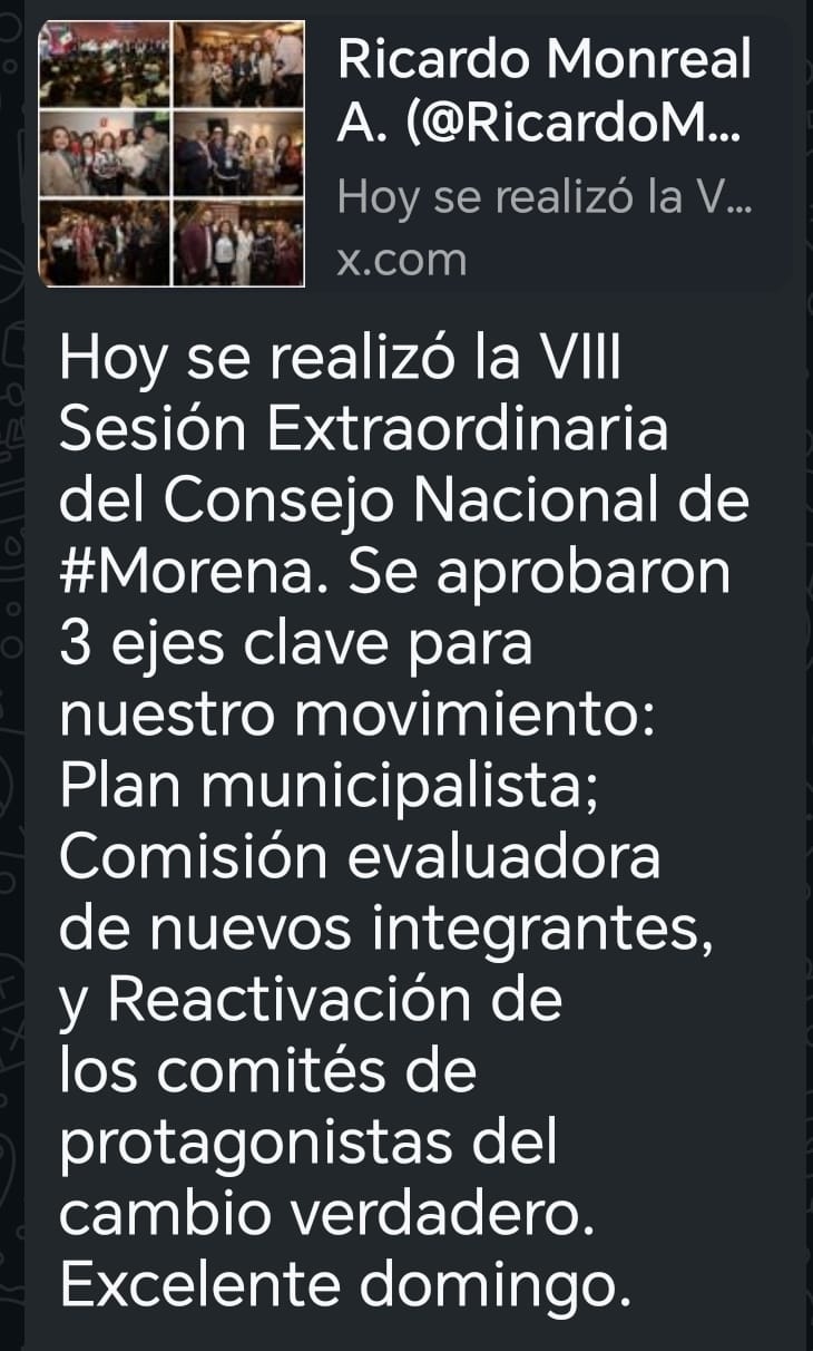 El coordinador de los diputados de Morena, Ricardo Monreal, celebró los resultados de la VIII Sesión Extraordinaria del Consejo Nacional del partido, donde se aprobaron tres ejes fundamentales: el Plan Municipalista, la creación de una Comisión Evaluadora de Nuevos Integrantes y la Reactivación de los Comités de Protagonistas del Cambio Verdadero.