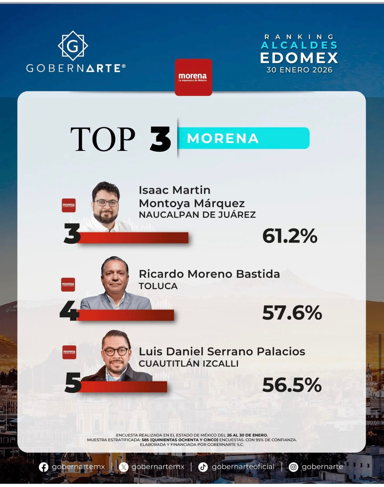 De acuerdo con los resultados más recientes difundidos por la casa encuestadora Gobernarte, el presidente municipal de Cuautitlán Izcalli, Daniel Serrano, se posicionó dentro del top tres de los alcaldes mejor evaluados de Morena en el Estado de México, al registrar un 56.5% de aprobación ciudadana.