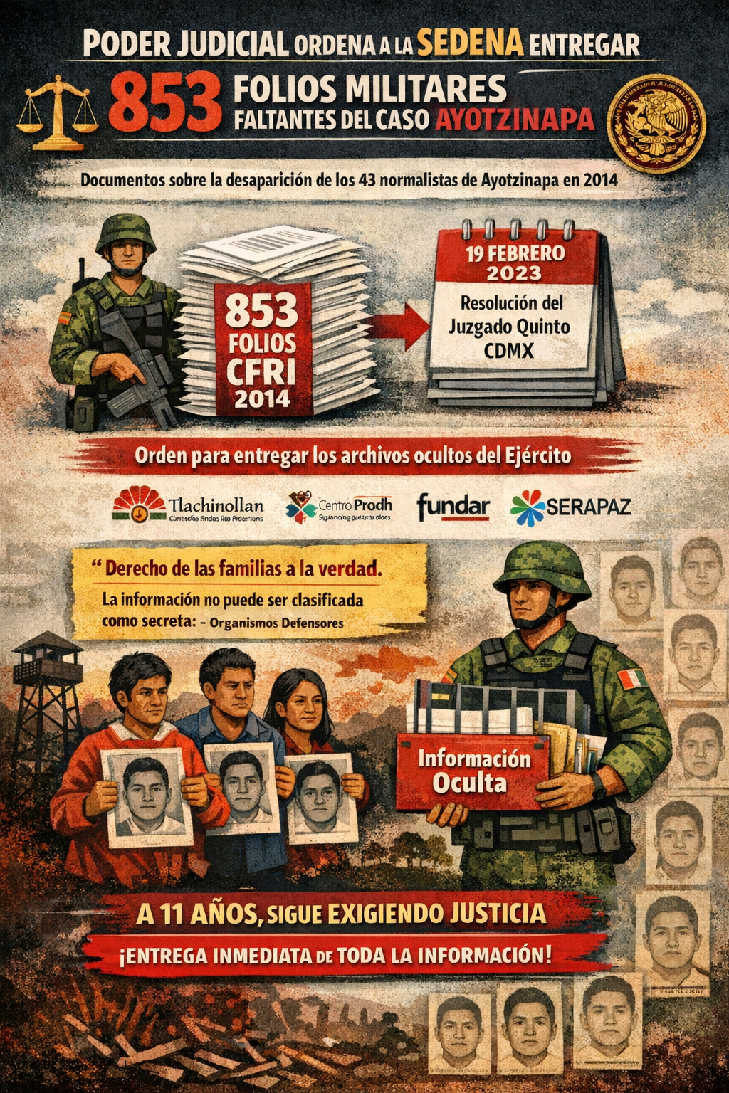La resolución, emitida el pasado 19 de febrero por el Juzgado Quinto de Distrito en Materia Administrativa en la Ciudad de México dentro del juicio de amparo 1350/2023, exige específicamente la entrega de 853 folios militares generados en 2014 por el Centro Regional de Fusión de Inteligencia “Centro” (CFRI), con sede en Iguala, así como por otras instancias de inteligencia del Ejército. Estos documentos han sido reclamados persistentemente por las familias de las víctimas durante años, según confirmaron los centros de derechos humanos Tlachinollan, Miguel Agustín Pro Juárez, Fundar y Serapaz.