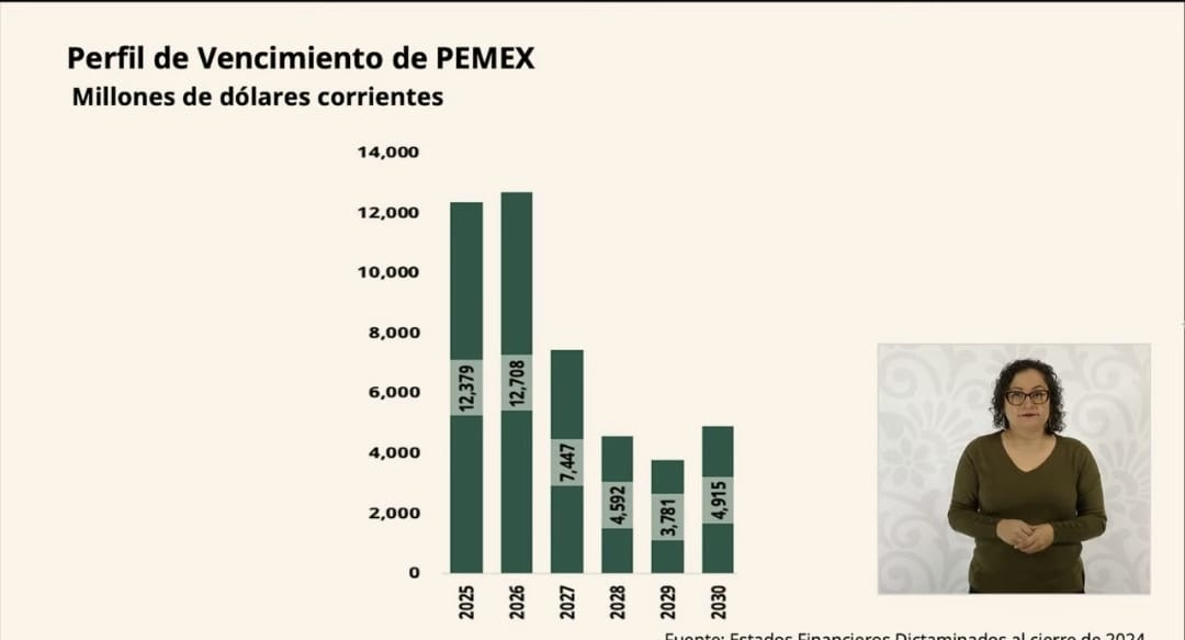 De acuerdo con cifras oficiales, en 2025 vencen 12 mil 379 millones de dólares y en 2026 serán 12 mil 708 millones. Posteriormente, los pagos descenderán: 7 mil 447 millones en 2027, 4 mil 592 en 2028, 3 mil 781 en 2029 y 4 mil 915 en 2030. Amador subrayó que estos compromisos derivan del endeudamiento contratado en administraciones anteriores y que el rescate financiero de Pemex busca apoyar a la empresa frente a esos vencimientos. Recordó que la deuda de la petrolera aumentó 130 por ciento en una década, al pasar de 43 mil millones a 105 mil millones de dólares, mientras su producción de gasolina y diésel caía.