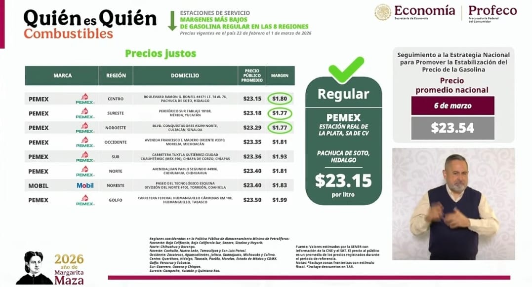 Destacó que una de las estaciones con menor precio se localiza en Pachuca de Soto, Hidalgo, donde una gasolinera de Petróleos Mexicanos vendió el litro de gasolina regular en 23.15 pesos. En contraste, señaló que una estación de Petro Seven en Arteaga, Coahuila registró un precio de 24.99 pesos por litro, con un margen de ganancia de 3.27 pesos.