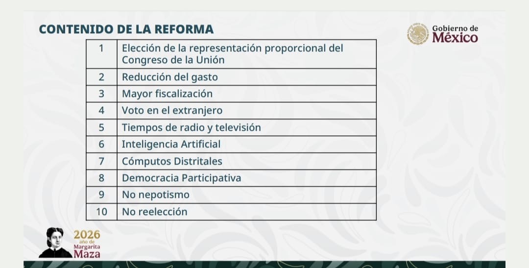 La secretaria de Gobernación, Rosa Icela Rodríguez, explicó que la iniciativa de reforma constitucional en materia electoral impulsada por la presidenta Claudia Sheinbaum Pardo se estructura en cuatro ejes y diez puntos con el objetivo de fortalecer la vida democrática, reducir costos y ampliar la participación ciudadana.