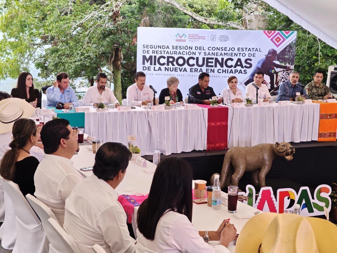 Posteriormente, participó en la Segunda Sesión del Consejo Estatal de Microcuencas, donde se presentaron avances del Programa de Restauración y Saneamiento de Microcuencas de la Nueva ERA en Chiapas, enfocado en la reforestación y conservación de suelos a través de acciones ambientales integrales en microcuencas prioritarias.