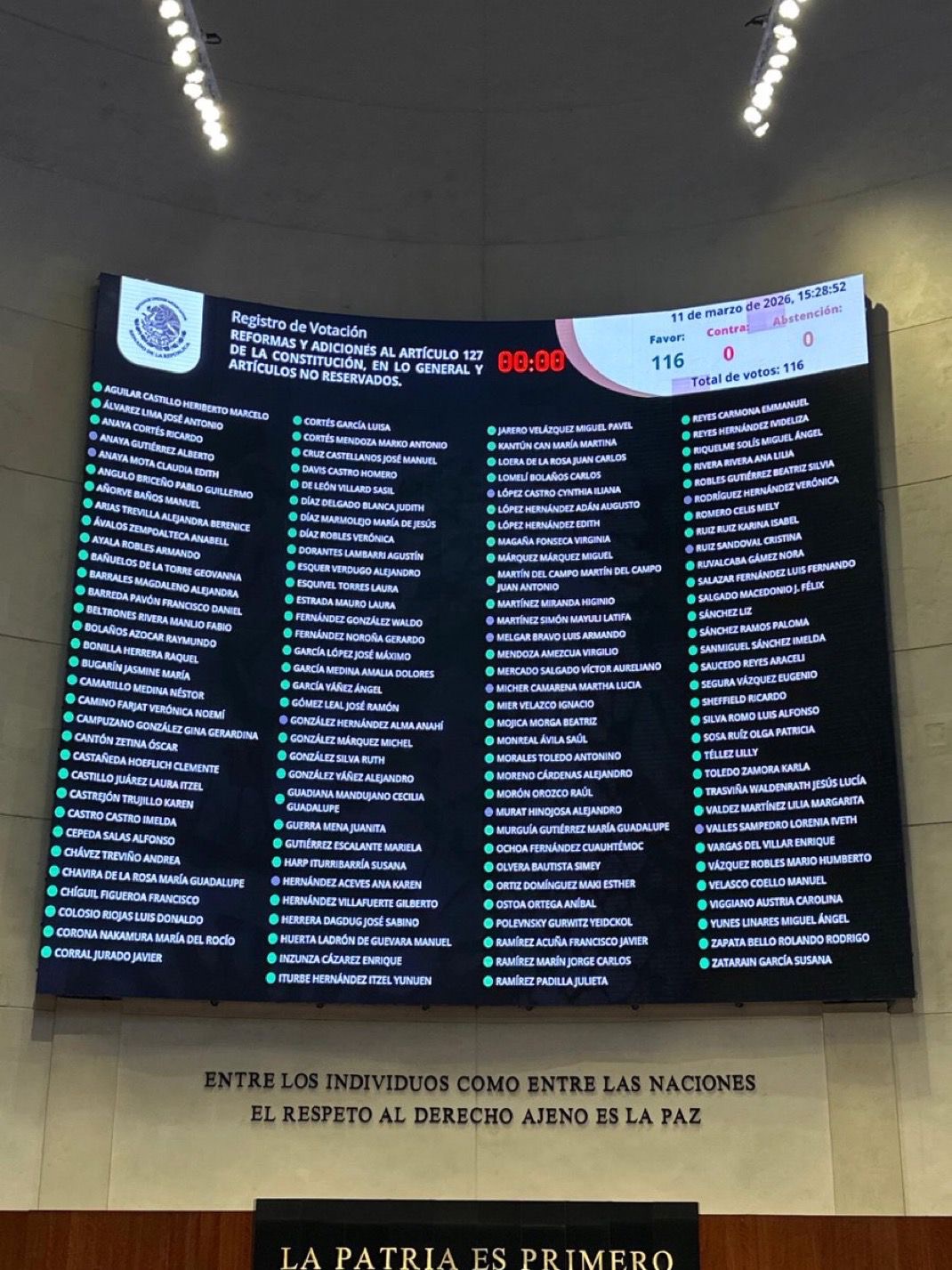 Con 116 votos a favor en el pleno, la iniciativa fue avalada para modificar el artículo 127 de la Constitución Política de los Estados Unidos Mexicanos y establecer un límite a las jubilaciones y pensiones en el sector público, de manera que ninguna persona servidor público pueda recibir ingresos superiores a la mitad de la remuneración de la persona titular del Poder Ejecutivo Federal.