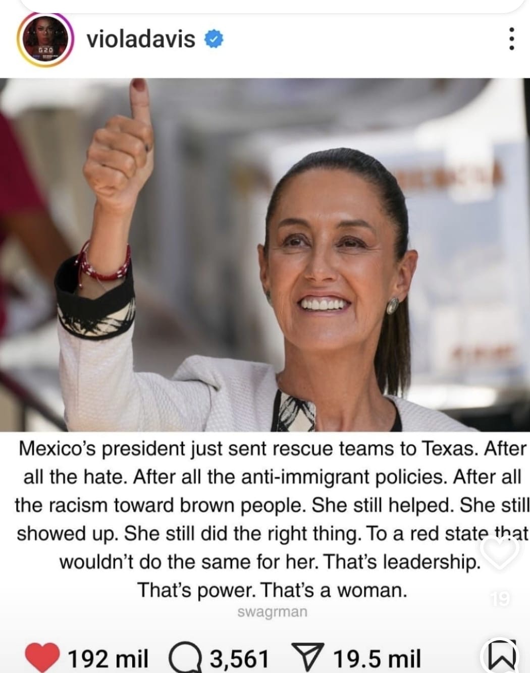 Por su parte, la actriz Viola Davis escribió en su cuenta de X: “Gracias, México, por enviar a sus valientes bomberos a Texas. La solidaridad no tiene fronteras. Ustedes han mostrado lo que significa cuidar al prójimo. Mi respeto y gratitud”.