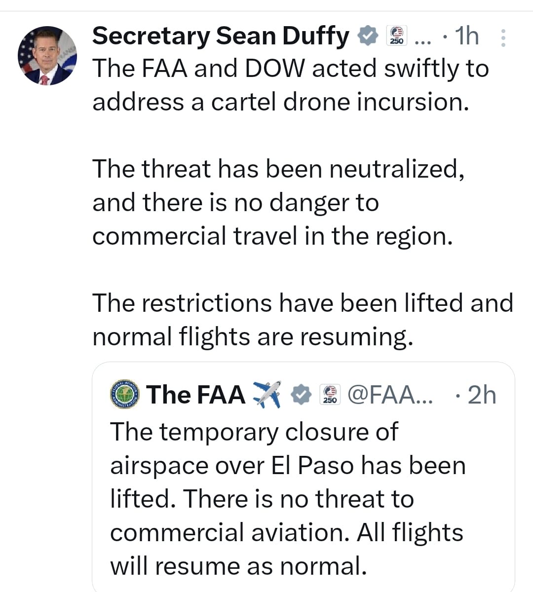 El cierre del espacio aéreo en El Paso fue anunciado por la Administración Federal de Aviación de Estados Unidos por razones especiales de seguridad y se extendió por varias horas antes de que se reanudaran las operaciones, tras determinarse que no había una amenaza para la aviación comercial. Autoridades estadounidenses informaron que la medida se adoptó ante una incursión de drones que violaron el espacio aéreo y que la situación fue neutralizada.
