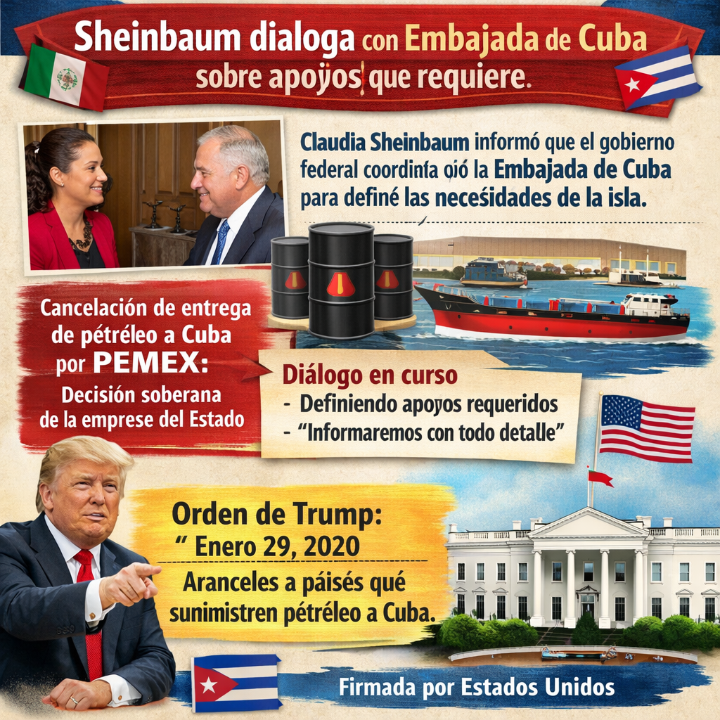 Sheinbaum contextualizó que este escenario ocurre después de que, el pasado 29 de enero, el presidente de Estados Unidos, Donald Trump, firmó una orden ejecutiva que autoriza la imposición de aranceles a bienes procedentes de países que suministren petróleo a Cuba.