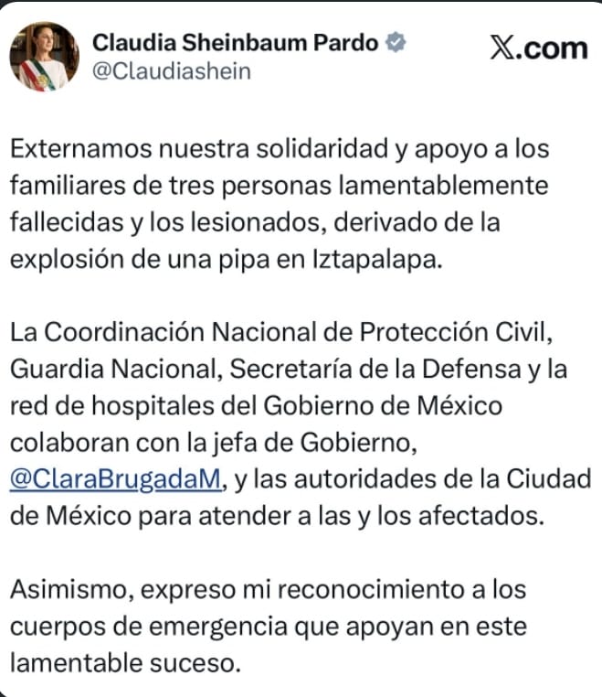 En su publicación, Sheinbaum señaló: “Externamos nuestra solidaridad y apoyo a los familiares de tres personas lamentablemente fallecidas y los lesionados, derivado de la explosión de una pipa en Iztapalapa”.