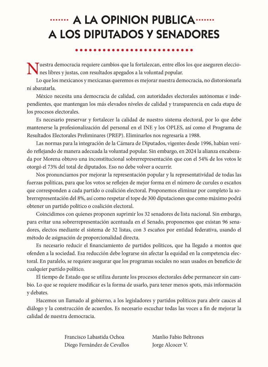 Sheinbaum cuestionó el desplegado difundido por figuras como Manlio Fabio Beltrones, Diego Fernández de Cevallos y Francisco Labastida Ochoa, señalando que su postura en contra de la reforma los convierte en “el mejor símbolo del PRIAN desde Carlos Salinas de Gortari”, en referencia a la histórica confluencia entre el PRI y el PAN durante finales del siglo XX.