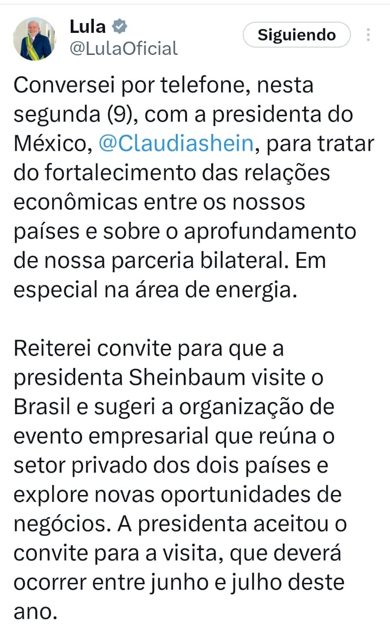 A través de un mensaje difundido en redes sociales, el mandatario brasileño informó que durante la llamada reiteró la invitación para que la presidenta mexicana realice una visita oficial a Brasil, con el objetivo de impulsar los vínculos políticos, económicos y comerciales entre ambas naciones.