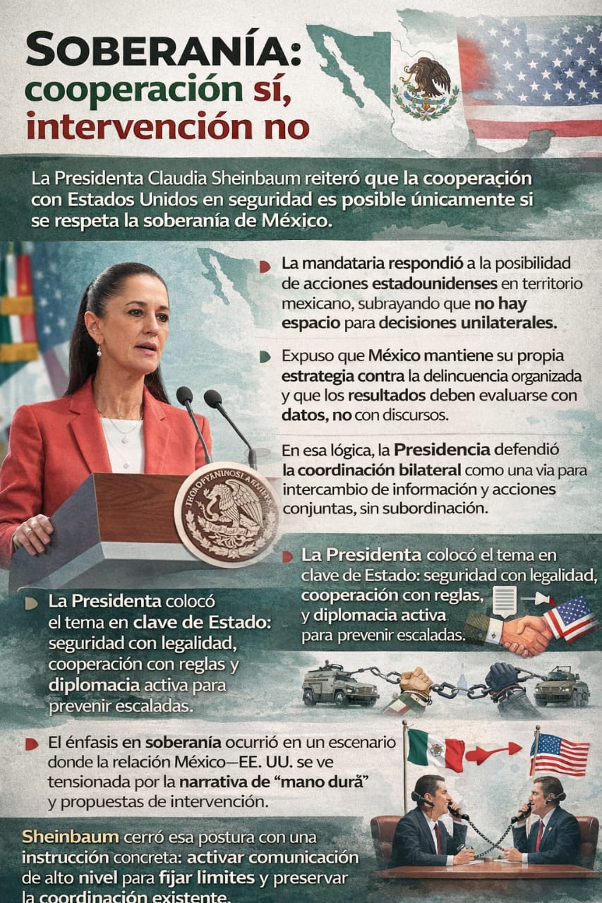 El énfasis en soberanía ocurrió en un escenario donde la relación México–EE. UU. se ve tensionada por la narrativa de “mano dura” y propuestas de intervención.