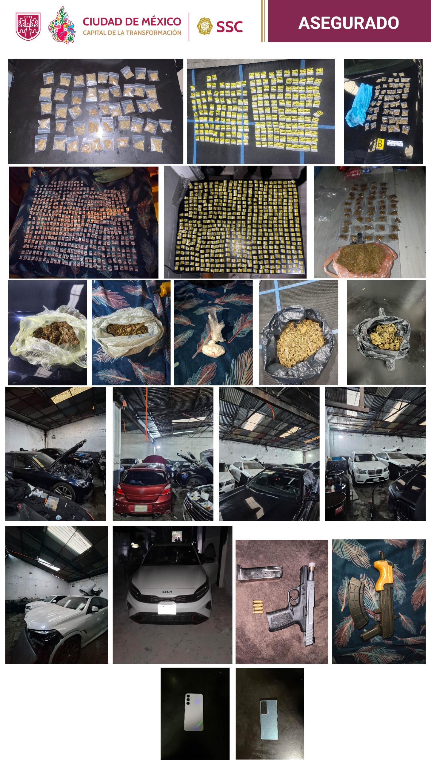 Finalmente en la misma calle Torno se ubicó el quinto predio, donde fue detenido un hombre y se aseguraron 500 dosis de posible clorhidrato de cocaína, 50 envoltorios de aparente marihuana, una bolsa con la misma hierba a granel, una báscula gramera de color gris, 15 vehículos de diversas marcas y modelos, y dos motocicletas.