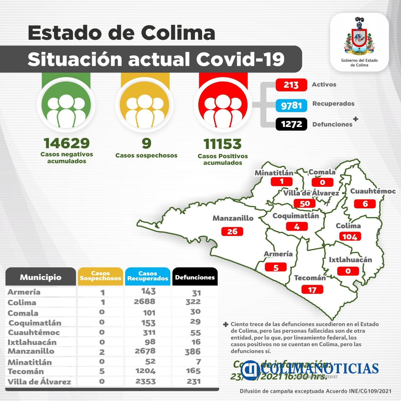 Colima.- Las instituciones del Sector Salud confirman que en la última jornada, se registraron 9 nuevos casos y una muerte por Covid-19, con lo que la entidad alcanza los 11 mil 153 positivos y 1 mil 272 decesos, acumulados por esta causa.