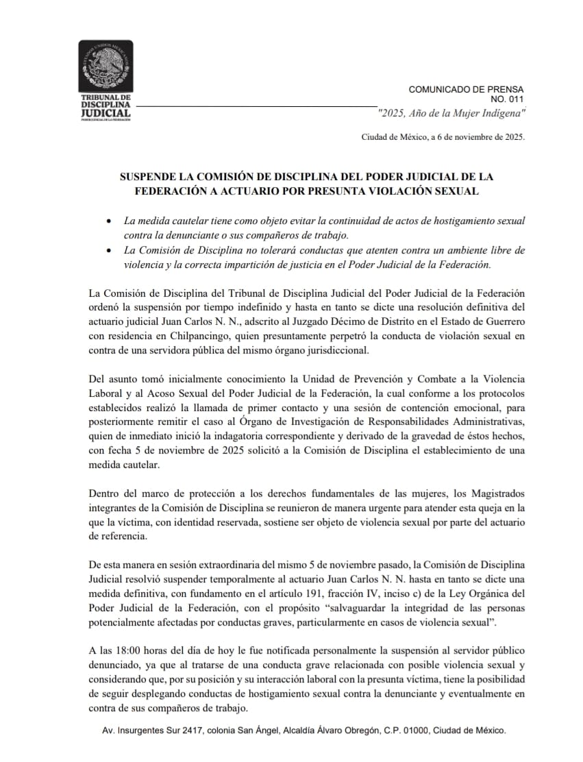 La Comisión de Disciplina del Tribunal de Disciplina Judicial del Poder Judicial de la Federación suspendió de manera indefinida al actuario judicial Juan Carlos N. N., adscrito al Juzgado Décimo de Distrito en Guerrero, con residencia en Chilpancingo, tras ser señalado por la presunta violación sexual de una servidora pública del mismo órgano jurisdiccional.