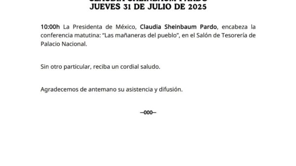 La presidenta de México, Claudia Sheinbaum, pospuso su conferencia matutina de este jueves 31 de julio para sostener una llamada telefónica con...