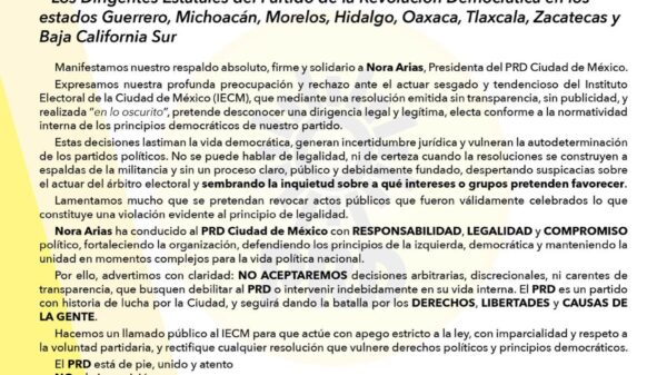 Dirigentes del Partido de la Revolución Democrática (PRD) en ocho entidades del país manifestaron su respaldo a Nora Arias Contreras como presidenta del PRD...