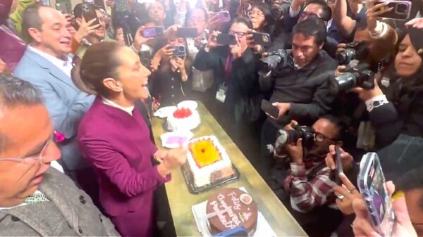 La presidenta Claudia Sheinbaum celebró su cumpleaños 63 al término de la conferencia matutina, con tres pasteles que le llevaron...