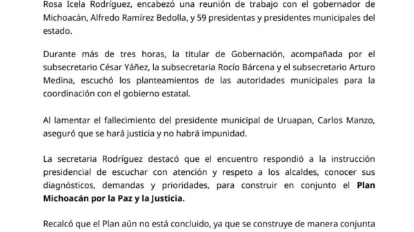 La secretaria de Gobernación, Rosa Icela Rodríguez, encabezó una reunión de trabajo con el gobernador de Michoacán, Alfredo Ramírez Bedolla, y 59...